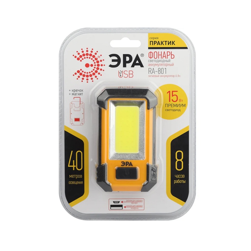 Фонарь Era RA-801 LED 15Вт, 6.0А*ч Li-Ion, магнит, USB, powerbank