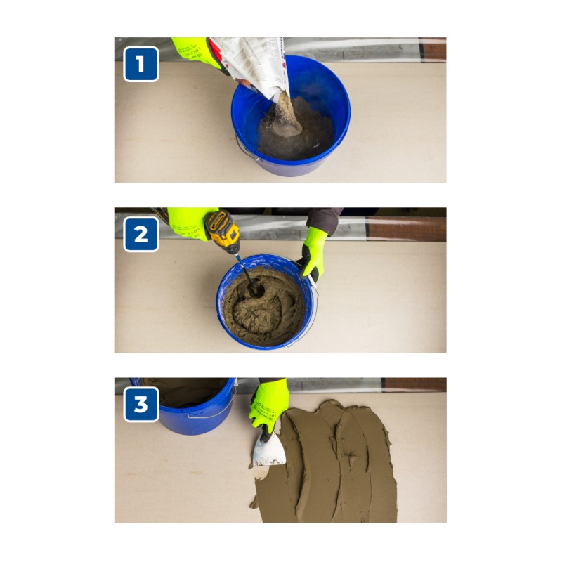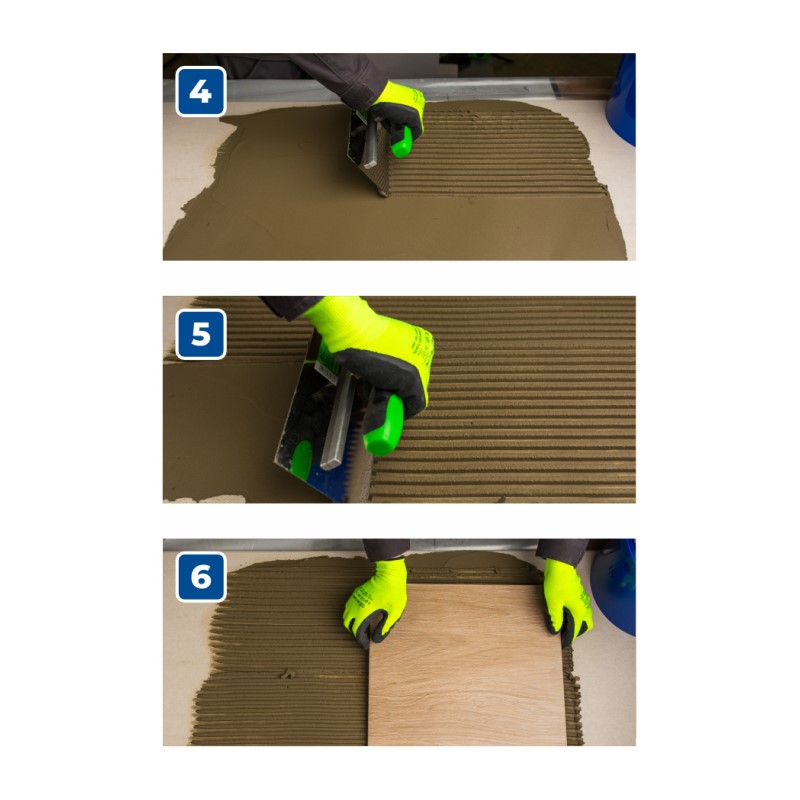 - Высокая адгезия: Максимальная толщина клеевого слоя — 15 мм, обеспечивает надёжное сцепление даже тяжёлых плиток.