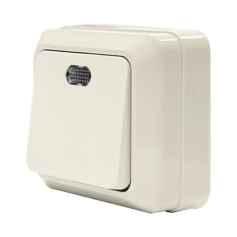 Одноклавишный выключатель открытой установки серии ОЛИМП, цвет слоновая кость.